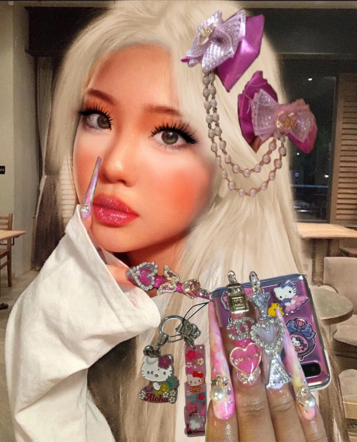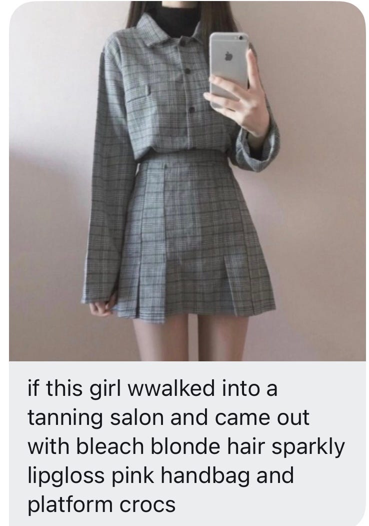 neogyaru: a hybrid of sophisticated ulzzang aesthetic and gyaru/kogal that devises the perfect balance of girly and bimbo chic . think of grey plaid ulzzang girl steps into the bimbofication machine but walks out only half way thru