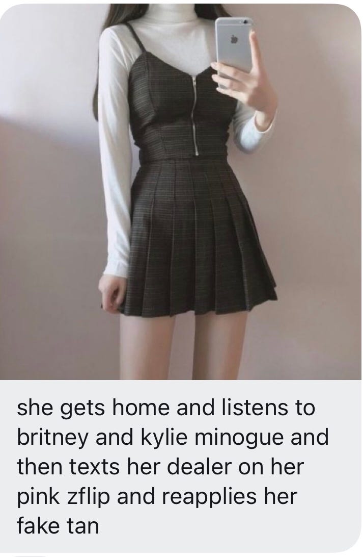walking across the bridge with ur angel blue tote bag swinging reading the new issue of egg magazine , your koss porta pros plugged into ur shiny pink ipod nano playing kesha while taking sips from ur medium mcdonalds diet coke . in your white collared shirt smeared with last nights fake tan , a silk school bow hanging on for dear life and your pale pink cardigan sleeves dotted with holes from your extravagantly long claws decorated in glitter, charms and gems , you flip your long curled pink and black extensions intertwined with your dead bleach blonde hair away from your face, covered in layers of makeup u spent only a matter of minutes on before sprinting out the door . it’s time for karaoke